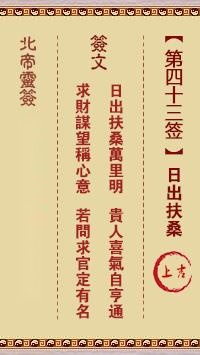 圣意日出扶桑万里明,贵人喜气自亨通。求财谋望称心意,若问求官定有名。