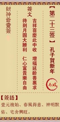 财神供奉是民间常见的民俗之一,中国主要供奉的五大财神,分别是中斌神:王亥(中),文财神:比干(东)、范蠡(南),武财神:关公(西)、赵公明(北)。在民间,人们在财神庙当中都会抽取财神灵签,沾福气,沾财气,以求在经商过程中能逢凶化吉,招财进宝。财神灵签一共有六十一签,财神灵签的签词采用各地财神庙中所存在的签词,每一签都是由签诗、注解等部分组成,签意简洁明了。
