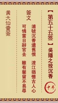 古人吴隐之,一位清官,曾来广东省当官,爱民如子,两袖清风,及辞官回家,人民感激其任内德政,纷纷赠以礼物,吴隐之一一婉拒,只受一沉香扇坠,及乘舟离任,风浪大作,吴隐之连忙查问家人手下有无收受利者,众人都说没有,但有人提醒他,吴夫人手上的沉香扇,乃一父老所赠。隐之祷告天地,将该沉香扇坠投于水,以示清廉,果然风平浪静,一路平安达家园,江上出现一小岛,后人因此称该处为沉香浦,渡江者每追念当年隐之之清廉,求得此签者,凡事平稳,须然吉中微有凶,但到底必好,不用忧疑。