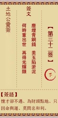 尘埋青钢钱,美玉陷淤泥,何时重出世,再得光辉显。〖断曰〗占讼不好、婚姻不好、谋事不成、出行不利、