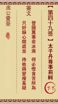 详解:此签有”自寻死路”之意。奉劝当事人,莫心怀不轨。有些人表面上对别人很好,但其实心里满是害人的念头,只是隐藏的很好,看不出来而已。须知此举也许可以骗得过旁人,但终究骗不了自己。表里不一的人是很痛苦的,有时说了谎,却又怕被揭穿,於是再说一个谎。如此恶性循环,提心吊胆。但是内心交战,知道是”明知不可为而为之”。这种良知的谴责,岂不是自我折磨、苦不堪言?所谓”害人之心不可有”。凡事要能行得正、坐得稳,勿存妄想邪念,免得害人又害己。